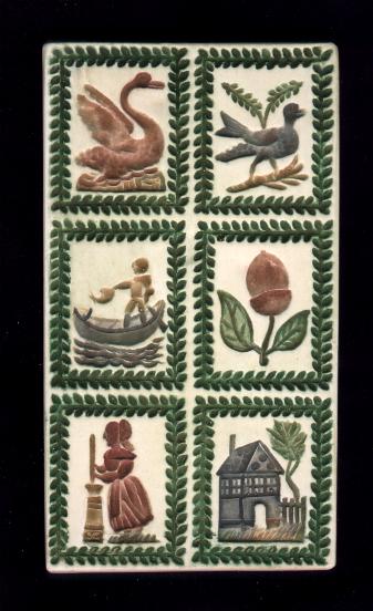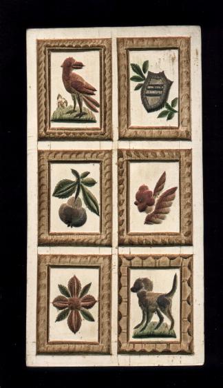 which depicts a cherub, a coat of arms, a flower, bird and pear.