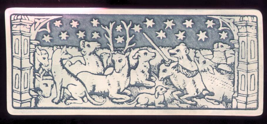 animals under the stars including unicorn, stag and dog.